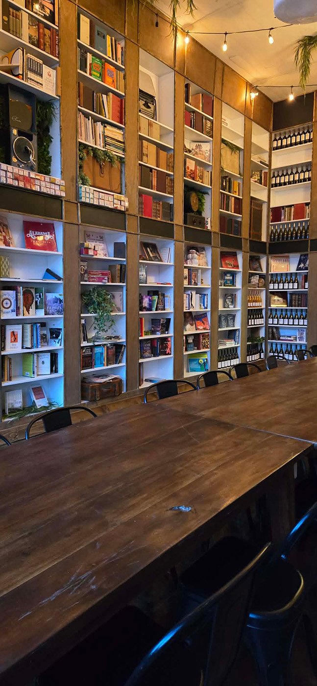 Beyond the bookshop area, the space opens into a dining room and cocktail lounge, offering a natural transition from daytime coffee to evening drinks. It’s the kind of layout that invites repeat visits for different reasons — a quiet afternoon, a casual meeting, or a night out.