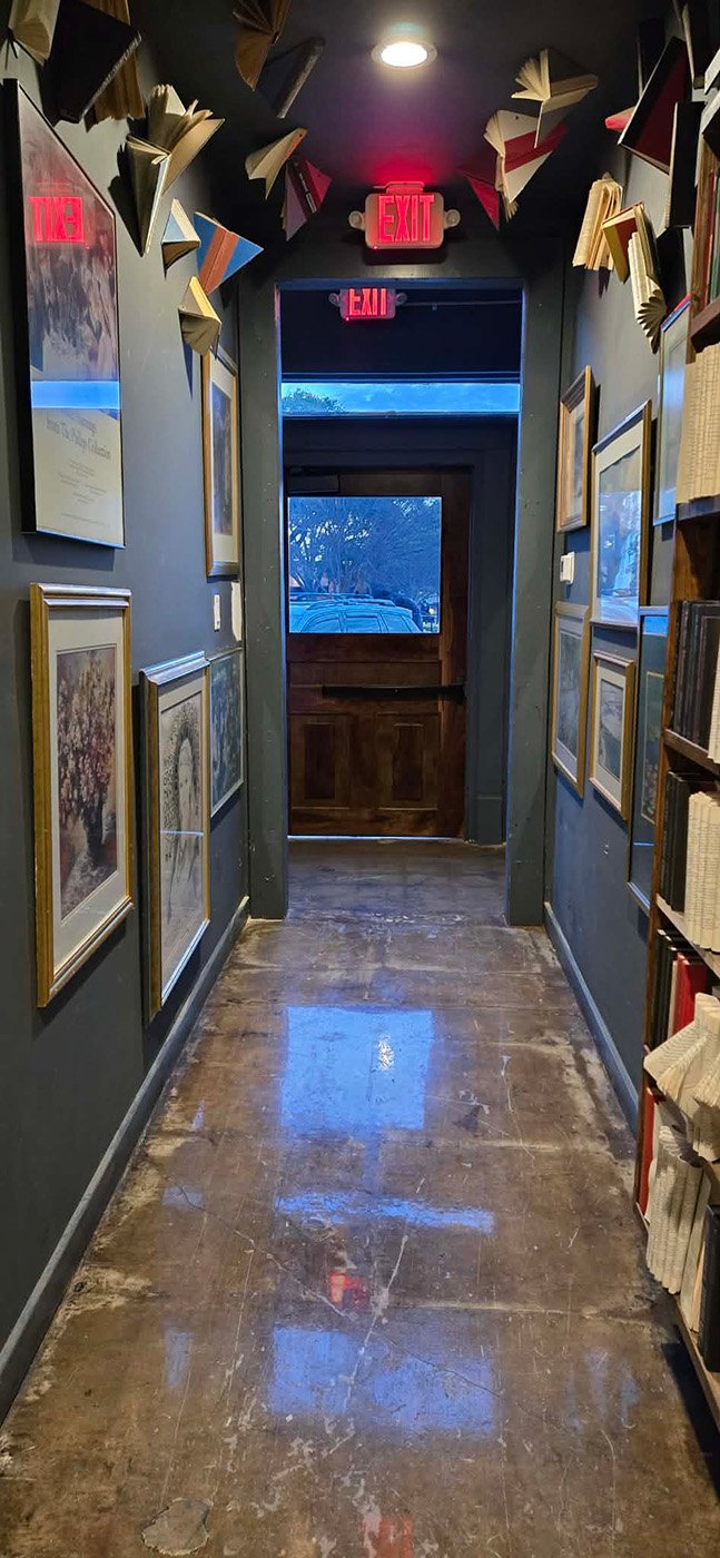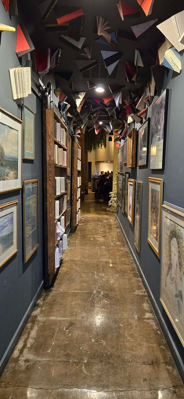 After visiting the restrooms — located down a hallway that felt like something straight out of a whimsical book illustration, complete with books suspended overhead — I continued on to explore Fable & Fire’s new event space.