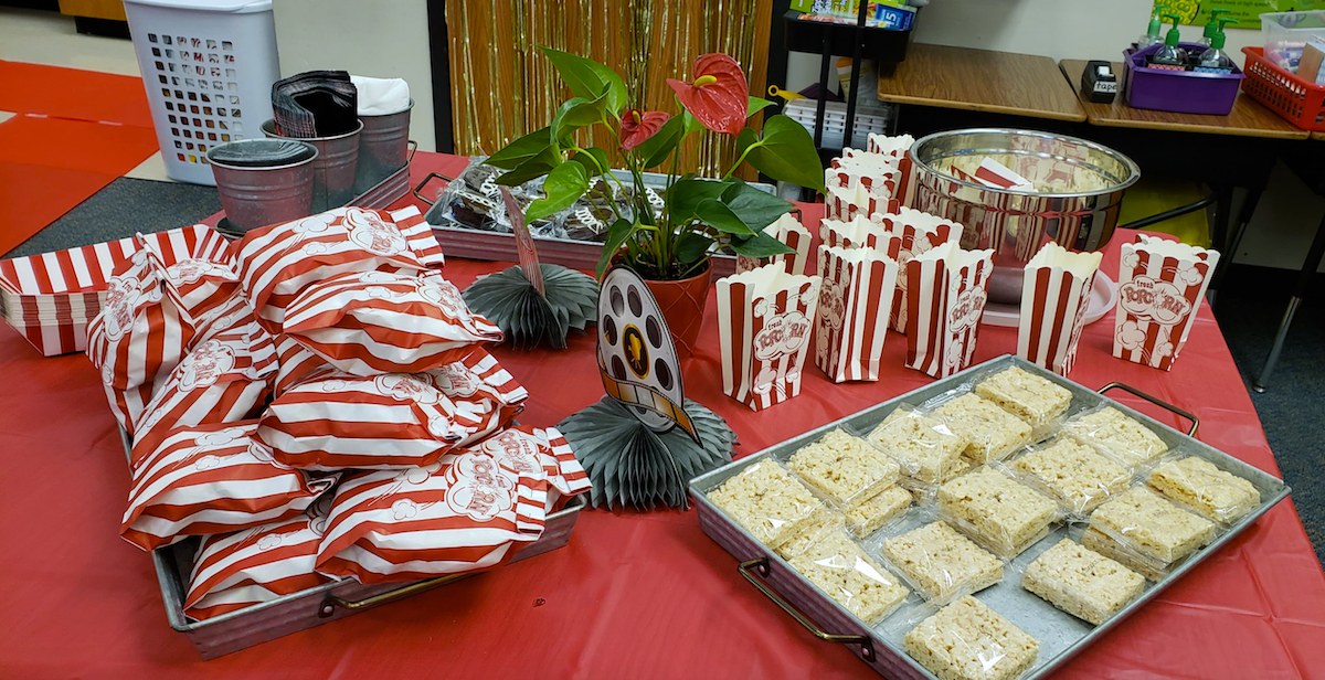 The day before the event, do your grocery shopping and prep the food. For our party, we served popcorn in adorable red-and-white striped bags, with flavors like Movie Theater Butter and Sweet & Salty Kettle Corn from Popcorn Indiana—easy, delicious, and a hit with the kids! We also grabbed a selection of snacks and treats from Walmart, including crispy rice treats, cupcakes, and mini bottled drinks.